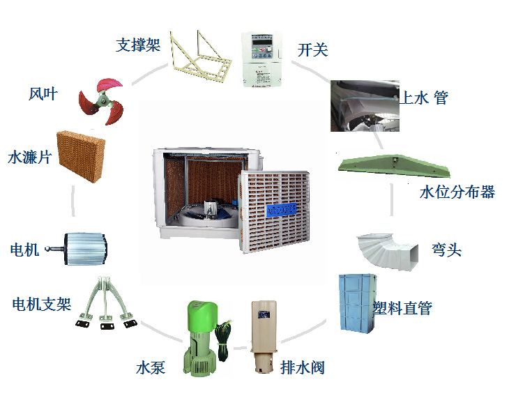 风叶:利用高分子工程塑胶注塑成形,优化的风叶角度,耐腐蚀,专业的冷风机叶轮,通过电机带动,达到均匀送风,带来舒适新鲜冷风。