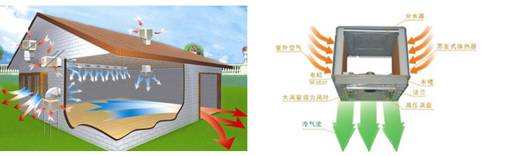 工作原理:当风机运行时,风机腔内产生负压,使机外空气流进多孔湿润有着优异吸水性的蒸发过滤网,蒸发过滤网上的水在绝热状态下蒸发,吸走大量热量,以此来降温。如图展示,热空气经过水帘进入机子,经蒸发冷却,转化成冷空气输出。